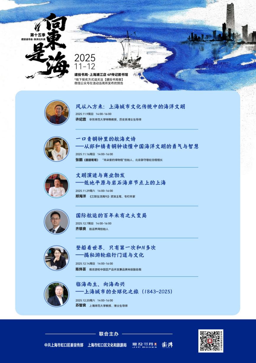 作为北外滩的一张人文名片,“建投读书会·澎湃北外滩”自2017年启动至今,已成功举办十四季共84期活动,推出“上海”“大师”“江南”“读城”四大主题系列,并汇编出版了《上海纪》《江南纪》,《读城纪》即将出版。从地理变迁、考古发现、风土人情、商业经济等多元视角,将高品质、有深度的人文思想注入北外滩滨江水岸。2023年,“建投读书会·澎湃北外滩”在上海市委宣传部、虹口区委宣传部支持下,入选由中央宣传部指导推出的第二届全民阅读大会·全民阅读地图。本季读书会由中共上海市虹口区委宣传部、虹口区文化和旅游局、中国建投集团建投书局和澎湃新闻联合主办,在“向东是海”的叙事中股牛网,唤醒城市的文化记忆,看见一个更加辽阔的上海。